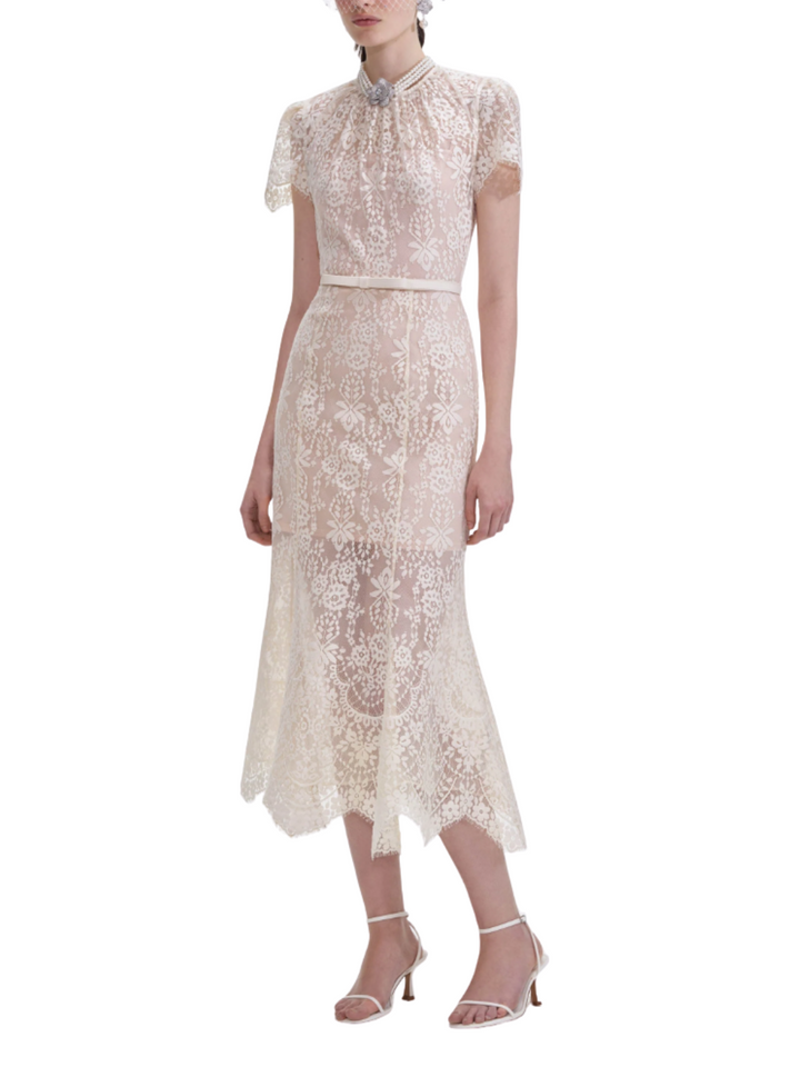Belted Pleated Satin and Lace-Trimmed Bouclé and Chiffon Midi Dress Cream