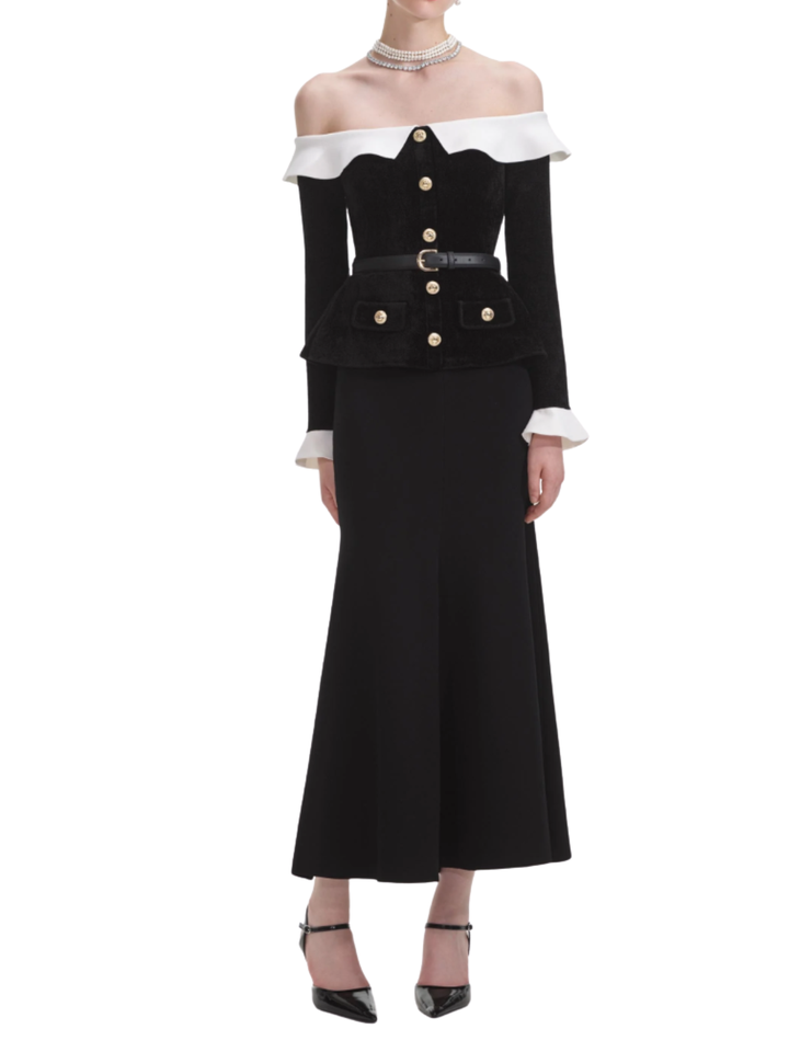 BLACK OFF SHOULDER HEAVY CREPE MIDI DRESS Black